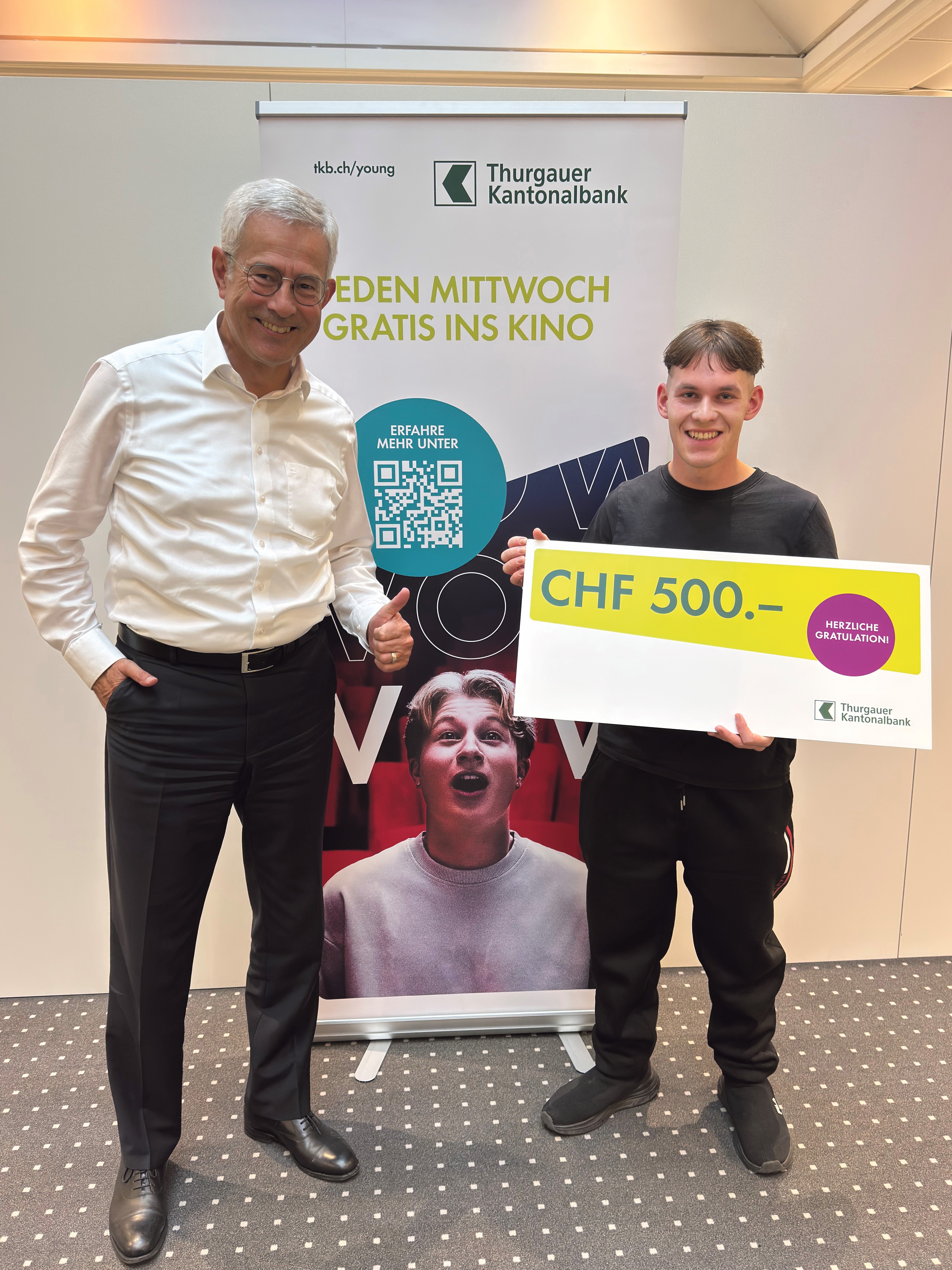 An der WEGA 2025 in Weinfelden stellte die Thurgauer Kantonalbank (TKB) an ihrem Stand das Jugendangebot «TKB Young» vor. Während der Messe konnten die Besucherinnen und Besucher zudem an einem Wettbewerb teilnehmen. Den Hauptpreis gewonnen hat Benito Niederer aus Kreuzlingen. Er durfte kürzlich von Hans-Jörg Schoop, Leiter der TKB Kreuzlingen, einen Gutschein über 500 Franken in Empfang nehmen.