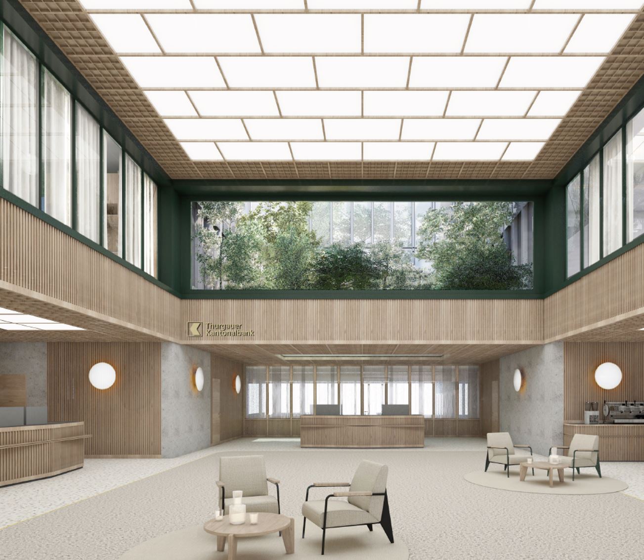 Im Innern bleibt der prägnante Betonbau weitgehend erhalten. In der Kundenhalle sind jedoch deutliche Anpassungen geplant: So wird ein grosses Fenster künftig den Blick auf einen begrünten Innenhof freigeben. Eine filigrane Decke mit Leuchtelementen bringt zusätzliches Licht in die grosszügige Kundenhalle. Während der Umbauzeit wird die Geschäftsstelle Weinfelden in ein Provisorium im Erweiterungsbau an der Freiestrasse 3 ziehen, wo Kundinnen und Kunden auf den bewährten TKB-Service zählen dürfen. Der Erweiterungsbau selbst ist vom Umbau nicht betroffen. Die bereits bestehende Passerelle zwischen Erweiterungsbau und Hauptsitz bleibt bestehen. Auch der Bankplatz soll aufgewertet werden. Rund ein Drittel der heutigen Asphaltfläche wird zurückgebaut, mit Bäumen bepflanzt und zu einer öffentlichen Begegnungszone umgestaltet.