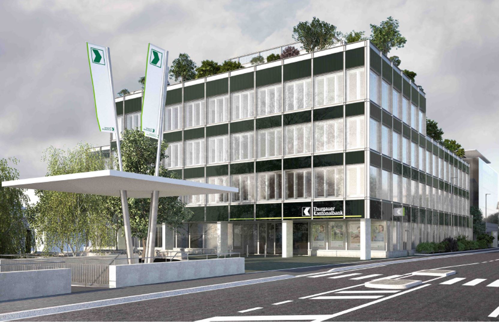 Die TKB möchte den markanten Betonbau aus den Sechzigerjahren erhalten und wenn möglich nach Minergie-Standard modernisieren. Das ursprüngliche architektonische Konzept mit dem charakteristischen Gebäudekörper zum Bankplatz bleibt bestehen. Die Betonstruktur wird mit einer neuen Fassade aus Aluminiumprofilen ergänzt und geschützt. Gleichzeitig ist vorgesehen, eine leistungsstarke Photovoltaik (PV)-Anlage zu installieren, die das Gebäude mit erneuerbarer Energie versorgt. Die PV-Module werden auf den Dachflächen sowie an der Fassade angebracht und decken einen grossen Teil des Eigenbedarfs des TKB-Hauptsitzes ab. Weiter will die TKB die Terrassen auf der Ostseite teilweise für eine Volumenerweiterung nutzen und so zusätzlichen Raum schaffen. Ab dem 8. Januar ist die geplante Erweiterung mit Bauvisieren gekennzeichnet. Insgesamt bietet der Hauptsitz nach dem Umbau und der Volumenerweiterung offene und moderne Arbeitsplätze für rund 190 Mitarbeitende.