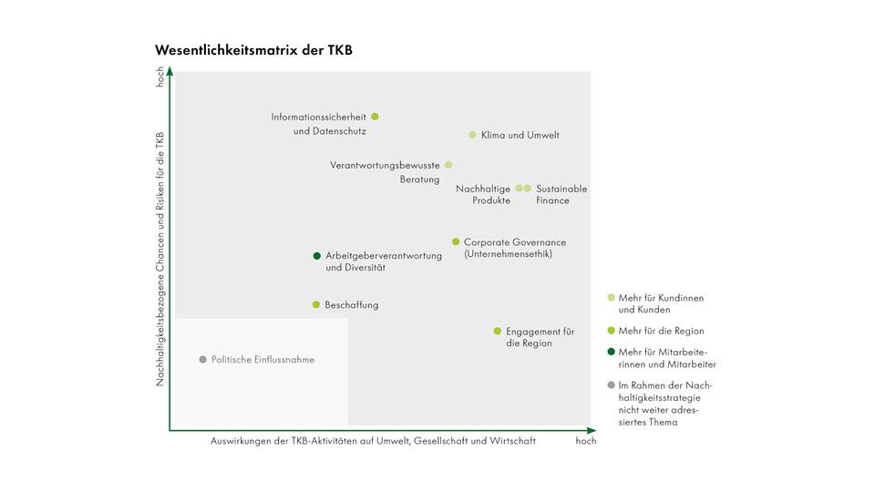 Im Zentrum des nachhaltigen Engagements der TKB stehen neun wesentliche Themen. Es sind jene nachhaltigkeitsbezogenen Themen, auf welche die Bank durch ihre Geschäftstätigkeit die grössten Auswirkungen hat (horizontale Achse) und welche besonders grosse Chancen und Risiken für die Geschäftstätigkeit der TKB bergen (vertikale Achse). Jedes wesentliche Thema ist einer Dimension der Bankstrategie zugeordnet und dementsprechend farbig markiert.